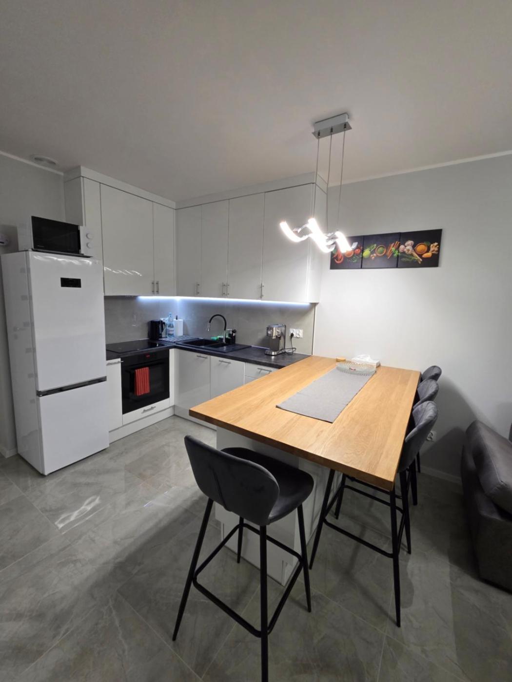 Oferta apartamentu obejmuje sypialnię (1), salon, kuchnię z pełnym wyposażeniem, w tym lodówką i ekspresem do kawy, a także łazienkę (1) z prysznicem oraz suszarką do włosów. W apartamencie zapewniono ręczniki i pościel.